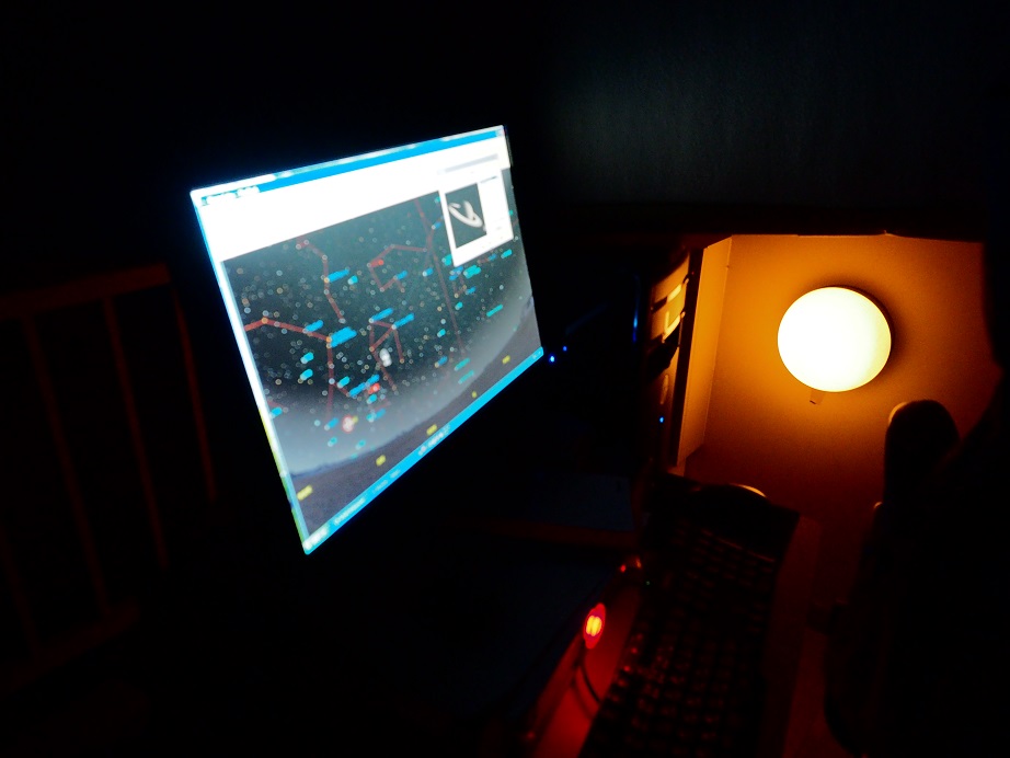 パソコンにて星の位置を確認。コンピューター制御で望遠鏡を動かすこともできるようですが、今日は手動で調整していました。