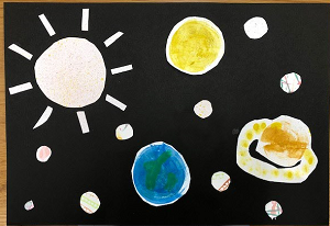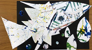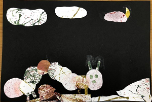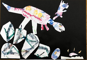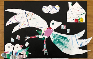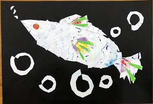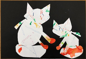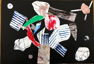 図工の時間に、歯ブラシやビー玉、ストロー、段ボールを使って絵の具でもようを作りました。その紙を使ってコラージュ作品を完成させました。とてもカラフルですてきな作品がいっぱいです。