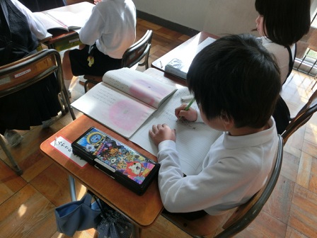 1年生が初めての視写(ししゃ)を行っていました。国語の教科書に出ている「てんとうむし」の詩を書き写していたのです。先生の指示を聞いた後、黙って自分で考えながら写していました。文章を言葉のかたまりとして認識することが大事。またノートではない罫線の入ったワークシートで書くことも鍛えになります。みんな集中して頑張っていました。できることがだんだん増える1年生ですね。