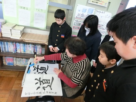 習字を教えていただいた田丸先生と城村先生が、書き初めをご覧になりに学校においでました。気にかけていただき感謝です。子どもたちにとっては、地域の方との貴重な触れ合いになったようです。