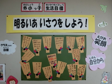 今月の生活目標もあいさつです。会釈がついてバージョンアップしたクラスもあります。