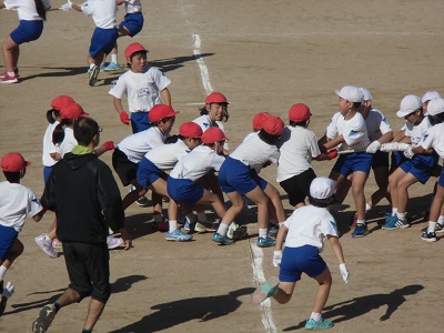 を行いました。真ん中に並べた短い綱を奪い合う競技です。