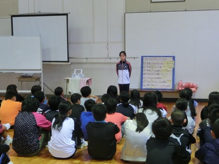 今朝の朝の集い 代表のあいさつ 七塚小学校と合同でした。
