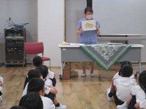 昼休みのお話会では秋にちなんだ大きな絵本を読んでもらいました。
