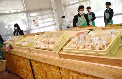 2年次生は、学校で作った野菜やお米、パン、加工食品、鉢花などの即売会担当