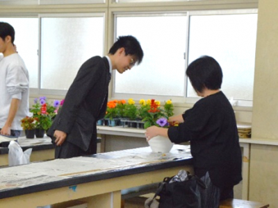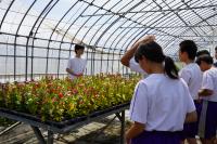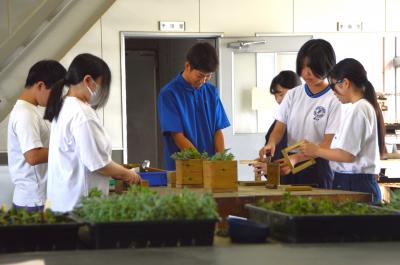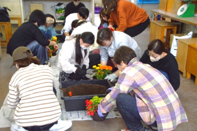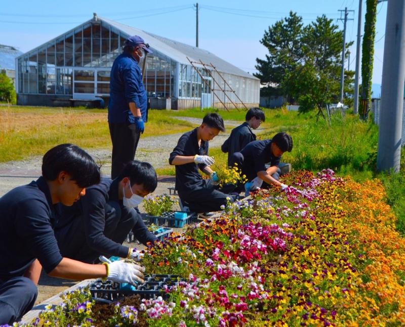 生物資源コースの生徒は花苗の植え付けや野菜の苗の定植、