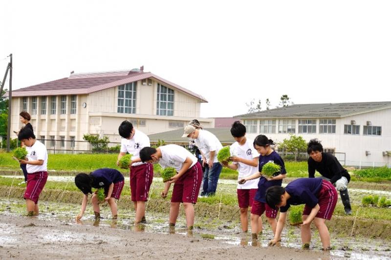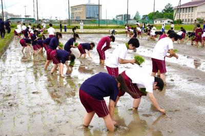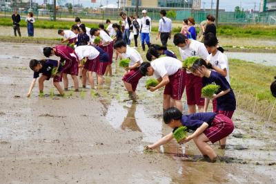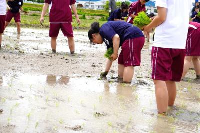 時にはぬかるみに足をとられそうになり、思わず絶叫する生徒もいましたが、皆、懸命に苗を植え、保護者の皆さんも時には笑みを浮かべ、温かく見守ってくださいました。