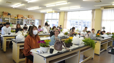 講師としてフラワー装飾技能士の福岡千恵先生をお迎えし、フラワーアレンジメントを教えていただきました。