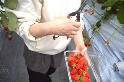 イチゴの甘い香りの中で、完熟イチゴを収穫しました。