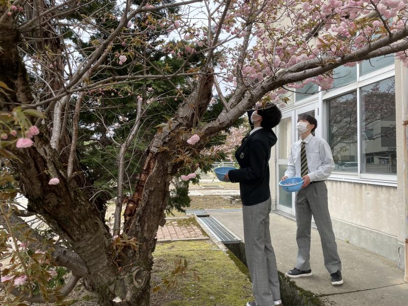 今回は環境棟の前で桜の塩漬け用の花摘みを行いました。塩漬けには八重桜が適するため、花びらが少し開いた状態のものを選んで摘みました。八重桜は花びらがたくさん重なっていてとっても綺麗で、お花見気分で花摘みしました。