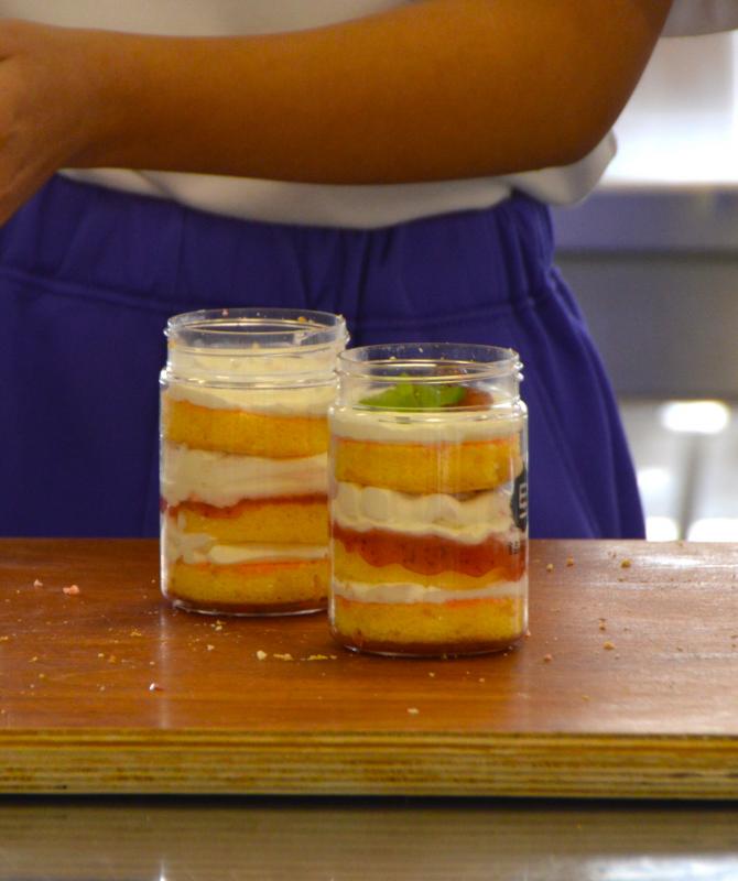 焼き上がったスポンジケーキと本校特製イチゴジャムや生クリームで仕上げたジャーケーキ。とても美味しそうに仕上がりました!