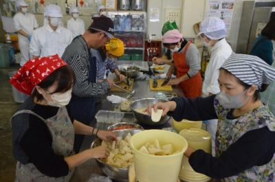 食品科学棟では、うどんの製造実習が行われていました。小麦粉から生地をこね、生地を最後には、うどんの太さに切り、ゆで上げ、水で締めて出来上がり!出来上がったうどんは、みんなで美味しく試食しました。どの生徒も笑顔いっぱいで頬張っていました。