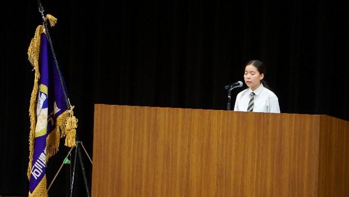 意見発表会 分野Ⅲ類 資源活用 地域振興において、「非常食の普及を目指して~能登半島地震を忘れない~」というテーマで意見発表した上谷菊環さんと、