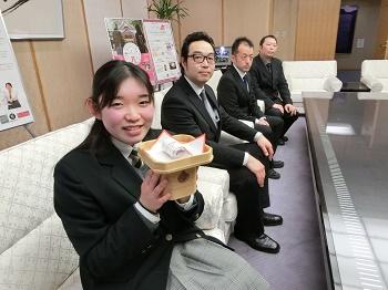 令和3年2月10日、白山市山田市長に「恋つゝみ」の第11回和菓子甲子園の優勝と商品化決定について報告しました。ネーミングや味について褒めて頂きました。