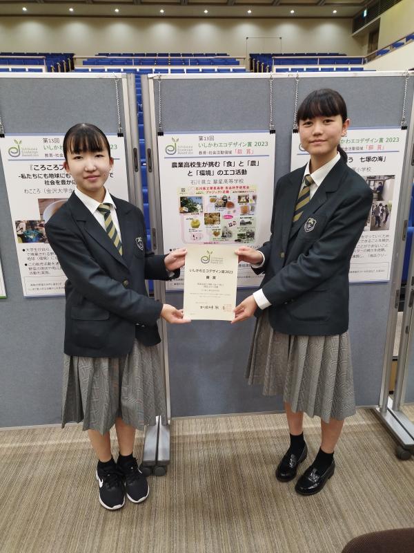 10月10日に石川県地場産業振興センターでいしかわゼロカーボンの日表彰式が開催され、本校の【農業高校が挑む「食」と「農」と「環境」のエコ活動】がいしかわエコデザイン賞教育・社会活動部門の銀賞を受賞しました。