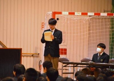 総会の最後に、来年度の次期社長に就任予定である2年生の上谷さんが挨拶し、