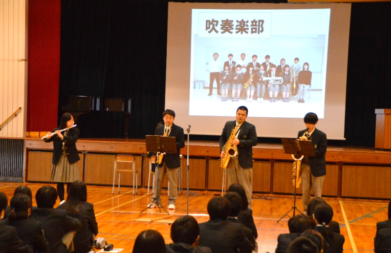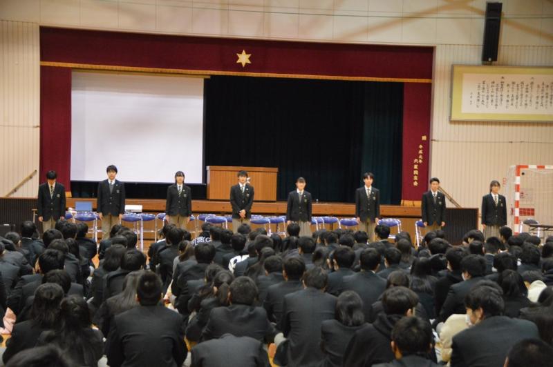 校歌紹介では、農業クラブ役員、生徒会、運動部有志の生徒たちが、高らかに校歌を歌い上げ、式場いっぱいに大きく歌声を響かせました。