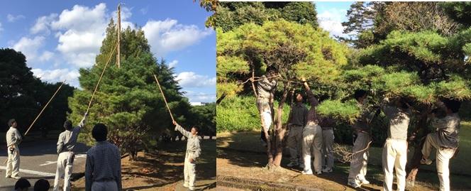 本校の前庭では、造園分野の生徒が、雪吊り作業を行い、早くも冬支度スタートです。