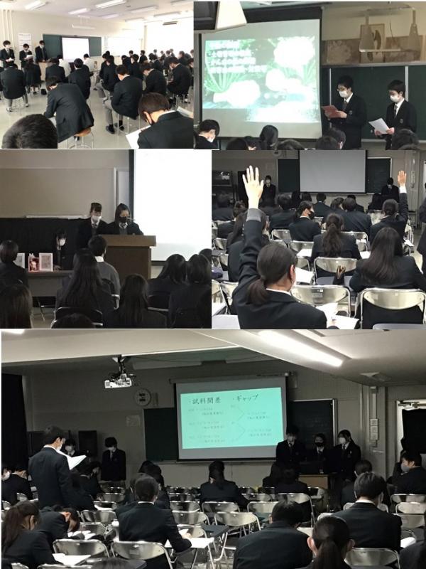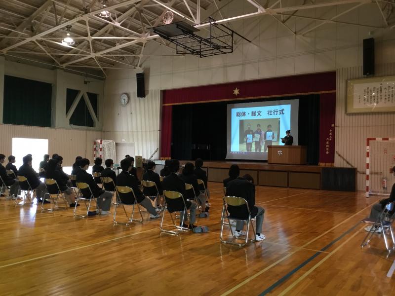 発表は第一体育館で行われ、新型コロナウイルス感染対策をとり、教室のオンライン中継による視聴も設けられました。