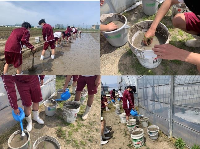生物資源コースの3年生(作物専攻)が、バケツ稲の定植作業を行いました。