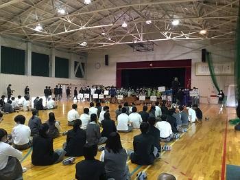 5月26日(水)6限後、総体総文の壮行式を実施しました。出場する部活動ごとにステージ上に立ち、大会の日程や抱負を話しました。校長先生と生徒会長31H勝田さんから激励の言葉、選手を代表しバドミントン部主将31H西口さんから挨拶がありました。3年生は第一体育館、1・2年生は教室でリモート参加し拍手で選手を応援しました。