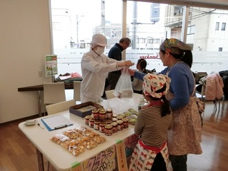 完成したジャムにはオリジナルのラベルを貼り、翠星高校で作ったバターロールと一緒に試食をしました。また、ふれ愛広場入り口では加工品の販売も行いました。