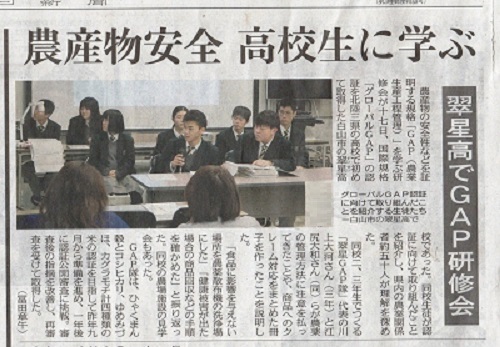12月17日(月)、グローバルGAP研修会を行いました。グローバルGAPは農作物の安全性などを証明する国際規格で、翠星高校は北陸三県で初めて取得できました。研修会では2,3年生の「翠星GAP隊」の生徒を中心に、グローバルGAP取得に向けて取り組んだことについて、県内の農業関係者に紹介しました。