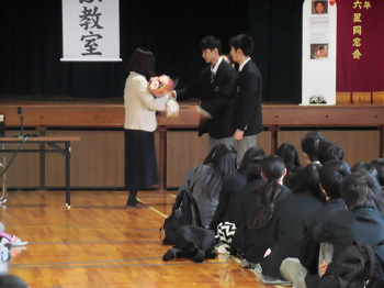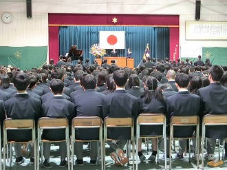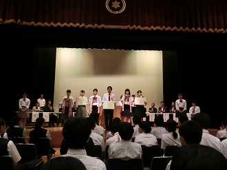 「食品科学研究会Ⅱ PAN-BU」が参加して行われました。日頃のプロジェクト活動の内容を分かりやすく発表していました。また、参観者から様々な質問や意見を受けて、生徒たちは新たな方向性を見出すことができました。終業式