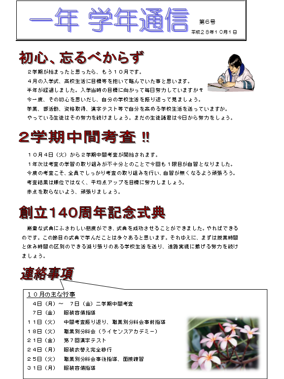 来年度に控える進路決定に向けて準備を始め、気を引き締めて日々の学校生活を過ごしてください。