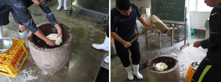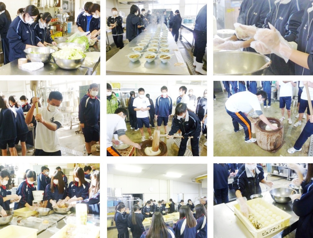 1年生は、産業探究(週2時間)で農業の楽しさを学んでいます。10月からは、3コース6分野に分かれ、専門学習を行っていますが、この日は、全コースが集い、作物の収穫を祝いました。環境科学コースがもちをつき、生物資源コースがあんやきなこに絡め、おにぎりも用意しました。食品科学コースは、豚汁をつくりました。全員そろっての収穫祭は、農業高校ならではの行事です。