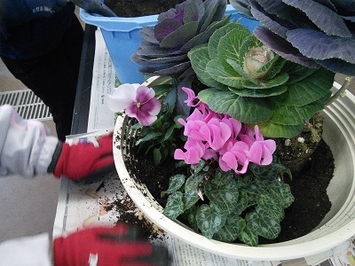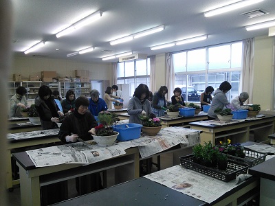 11月19日(土),白山市民を対象に翠星高校の園芸科学棟1階,農業実験室において市民講座が行われました。今回は草花の寄せ植えを行いました。寄せ植えに用いた草花は「ハボタン」「ガーデンシクラメン」「パンジー」「ナデシコ」です。受講された方は丹念に寄せ植えづくりをされていました。