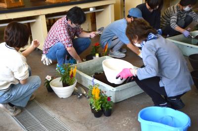 参加者それぞれに好きな色の花苗を4つ選び組み合わせて寄せ植えを楽しみました。