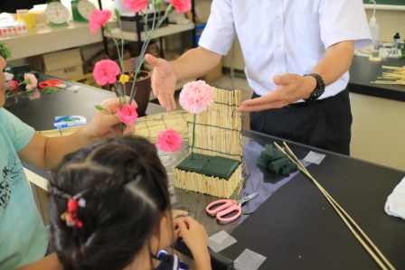今回はフラワーアレンジメント体験で、松任小、蕪城小、松南小、東明小の親子10組に参加していただきました。
