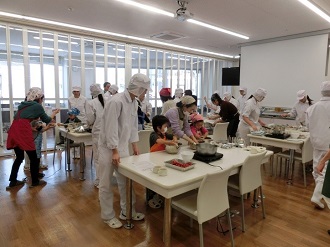 1月20、21日、食品科学コースの3年生25名がニュー三久(西念店)で「親子イチゴジャム教室」を開催しました。生徒達は日ごろの学習の成果を生かして、親子16組と一緒にイチゴジャムを作りました。また、生徒たちは一生懸命ジャムの作り方を親子に教え、ジャムに関する質問にも答えることで、参加者の方々と交流を深めました。