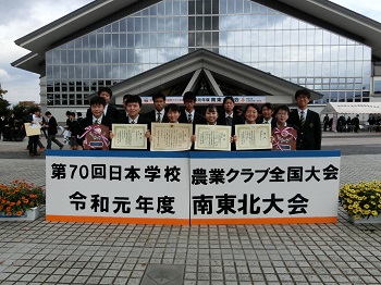 10月22日(水)~24日(木)に宮城・福島・山形の3県で「第70回日本学校農業クラブ全国大会 南東北大会」が行われました。この大会は農業高校生の甲子園とも呼ばれています。本校からはプロジェクト発表会分野Ⅲ類に6名、平板測量競技会に3名、農業鑑定競技会に4名が出場し、また石川県連会長は秋季代議員会に参加し、式典では旗手を務めました。