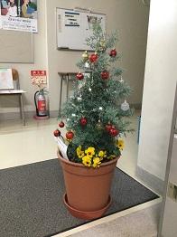 コニファーにも、リースで余った装飾品でデコレートし、クリスマスツリーに。