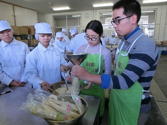 食品科学コース 日本赤十字社からベトナムの高校生来校 投稿日時 : 2018/11/28 広報 11月21日(水)日本赤十字社を通しベトナムの高校生2名が、食品科学コース1年生の授業に参加しました。1年産業探究では麹づくり3回目の授業で、生徒達が麹から作った甘酒の試飲や、麹漬け(べったら漬け)を製造し交流しました。ベトナムで普通高校に通う二人は、食品工場のように衛生管理をして授業を行う様子に驚いていました。 Tweet {{options.likeCount}} {{options.likeCount}}