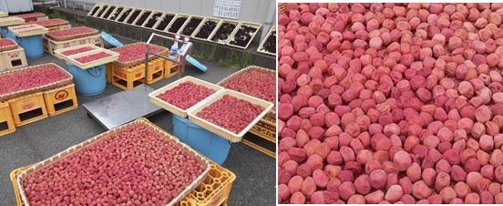 夏本番の日差しをしっかりと浴びて、だんだんと色鮮やかな赤色に梅が染まっていきます。