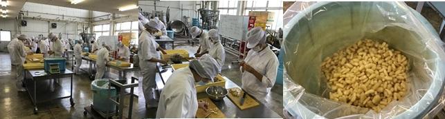 人気商品ラッキョウ酢漬けの前段階で、丁寧な下処理が必要であり、大量のラッキョウを暑さにも負けず、素早い動きで整形していきます。
