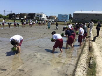 5月7日土曜日に公開授業があり、1年次生は1.2限目に13H.14H、3.4限目に11H.12Hの田植え実習がありました。快晴のもと生徒たちは慣れない田植え仕事に苦戦しながらも稲の苗を植えていました。