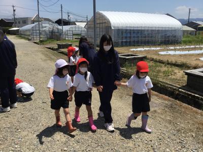 マスク、手指の消毒など感染対策をきちんとしながらお互いにあいさつをしたあと、手をつないで畑へ。
