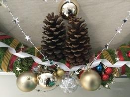 ダイオウショウの大きなマツボックリや装飾品でデコレーションを行いました。