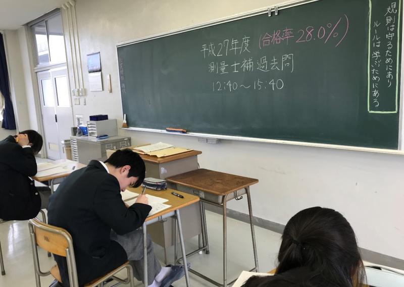 令和6年5月19日に実施される測量士補国家試験に、今年度も環境設計分野2年次生が挑戦します。今年は4名が「平均合格率30%の壁」に挑む決意を示し、12月の冬季休業期間中より放課後や休日の補習に取り組んでいます。現在、専門テキストによる試験範囲の補講をひととおり終え、いよいよ過去問試験(180分)にチャレンジです。環境設計分野では、これまでの4年間で7名の先輩方が合格し、取得した資格を生かしながら就職・進学各方面で活躍しています。全員合格を目標に、残り2ヵ月間頑張ります。また、今年度の結果についてもHPを通じてご報告いたします。 (報告者;教諭 市村 実)