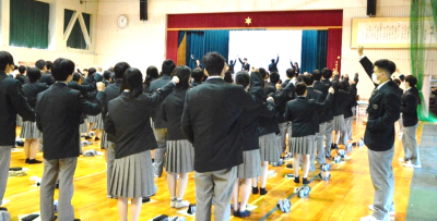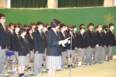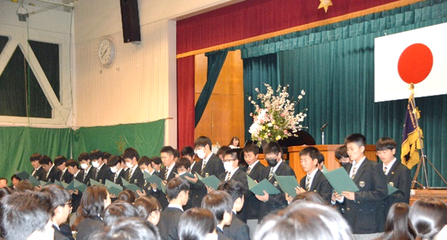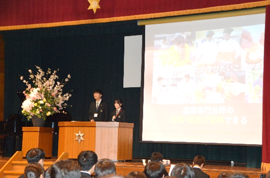 校歌紹介では、農業クラブ役員、生徒会、運動部有志の生徒たちが、高らかに校歌を歌い上げ、式場いっぱいに大きく歌声を響かせました。