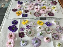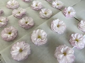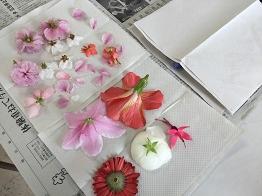 新聞紙を広げ、ペーパータオルを敷き、取ってきたお花を並べていきます。