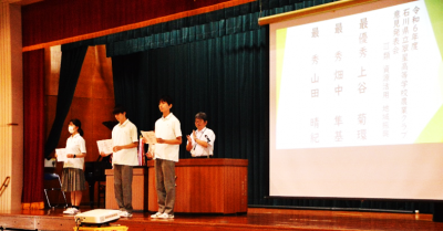 表彰伝達式では、第75回石川県学校農業クラブ連盟大会の6月4日に行われた校内意見発表会と、7月10日の県大会の意見発表、プロジェクト発表会の受賞者と、バドミントン部男子団体、卓球部女子団体が壇上に上がり、谷校長先生より賞状やトロフィーが授与されました。
