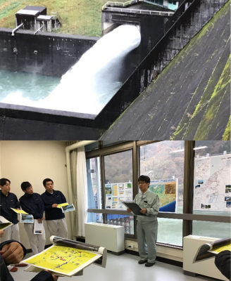 現在は、建設後約56年経過したため、国が取水塔をはじめ様々な箇所での補修工事を実施しています。私たちは、専用エレベーターでダム最深部まで降り、めったに見ることのできない堤体内部を見学させていただきました。その後、洪水吐ゲート付近の出口から屋外に出ると、見上げれば50m以上もの高さを誇る巨大な重力式コンクリートダムがそびえ立っており、人工構造物の雄大さを実感しました。