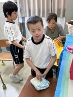 「みんなで作ろう!」では、グループに分かれて「秋の木」の貼り絵をしました。グループごとに色を選んだり「ここに貼ってもいい?」「いいよ!」などいろいろ話をしながら、作品を作っていました。完成後に児童ができた作品を発表し、「上手やね~」と拍手をもらいうれしそうにしていました。