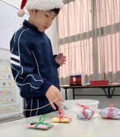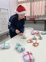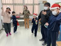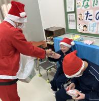 12月11日(木)の生活単元学習の時間に「クリスマス会」をしました。鈴を鳴らしながら「あわてんぼうのサンタクロース」を歌ったり、プレゼント釣りのゲームをしたり、おやつを食べたりしました。その後は、毎日頑張っている子供たちを見ていたサンタさんが来て、一人ずつにプレゼントを渡してくれました。