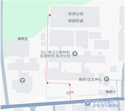 宝立校舎校門から入り、左側を抜けて来校してください。なお、